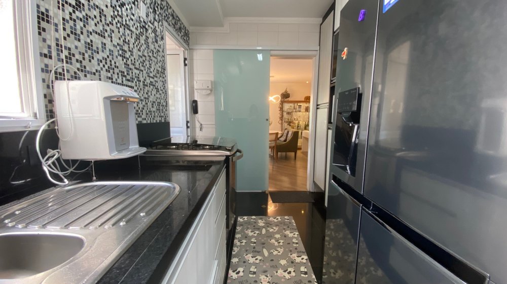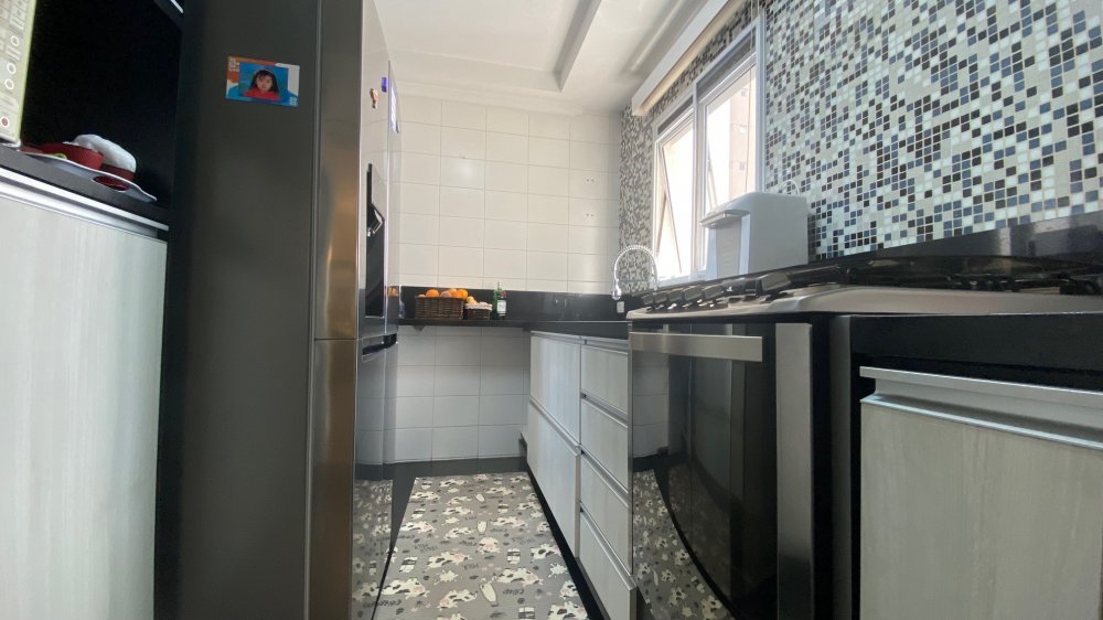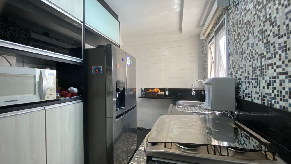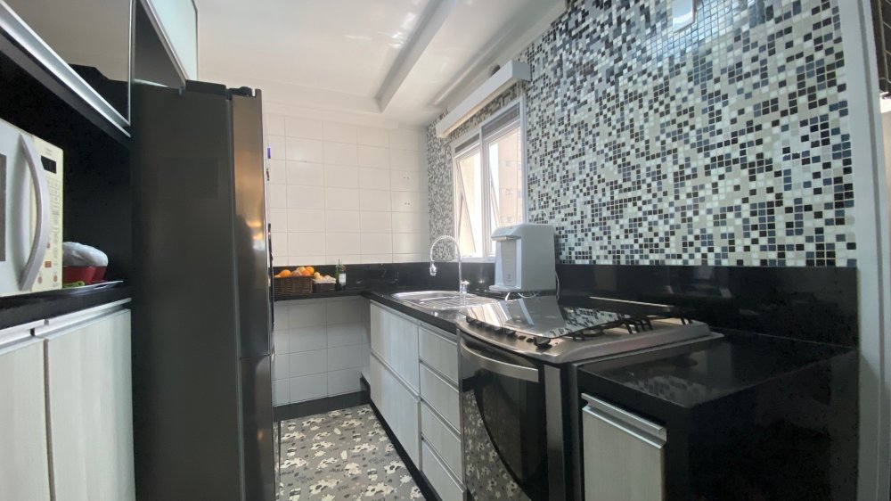 Conta com cozinha repleta de armários e equipada com cooktop, ampla área de serviço, 3 suítes, ar-condicionado e 2 vagas de garagem fixas ao lado dos elevadores.