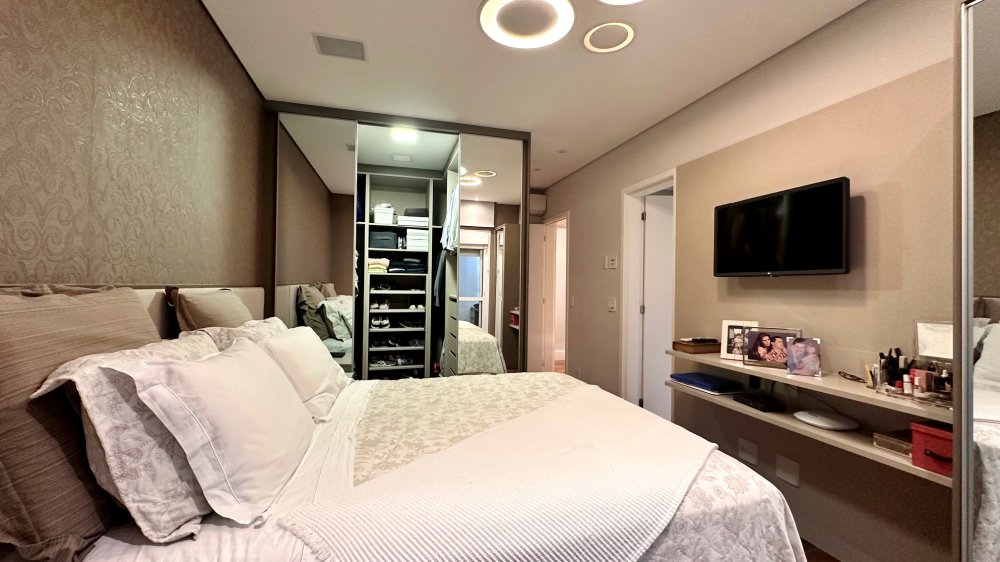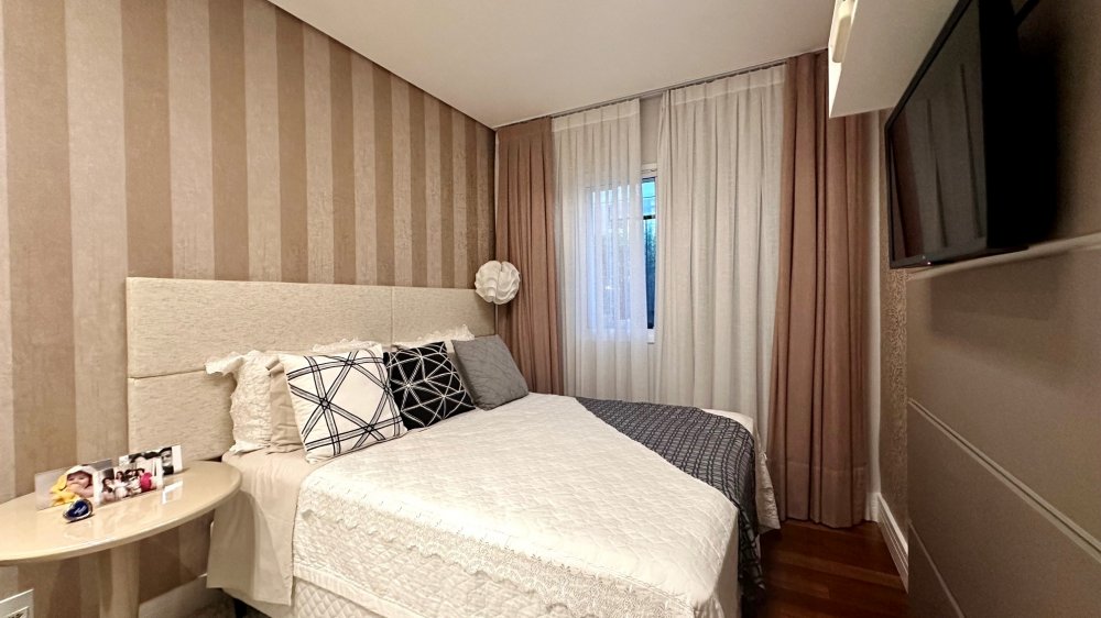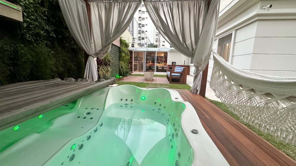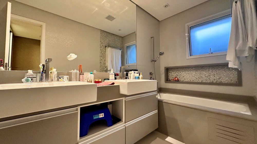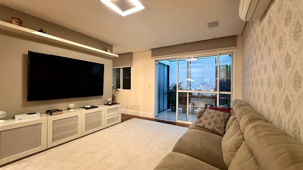 Excelente planta com 4 dormitórios, sendo 3 suítes. A suíte máster conta com closet, vista para o verde, com um espaço super agradável para massagem e maquiagem. Ar-condicionado em todos os ambientes; espaço gourmet com churrasqueira da Tuboar, torre forno com aparelhos da Tecno e adega foi feita sob medida para o apartamento, tudo de primeiríssima qualidade. A área externa possuí uma ampla área verde com banheira de hidromassagem, completamente privativa, lareira à gás, jardim e horta. 3 vagas de garagem e depósito privativo. Condomínio estilo europeu com andares baixos e totalmente arborizado. Infraestrutura de lazer para todas as idades.