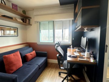 O amplo living, conta com um espaço ideal para home office, e se integra à varanda gourmet com churrasqueira, perfeita para receber amigos e familiares.