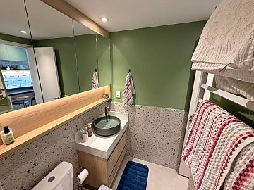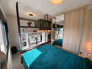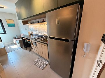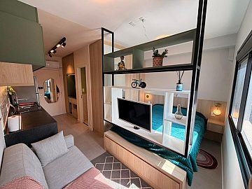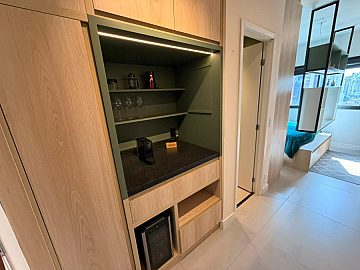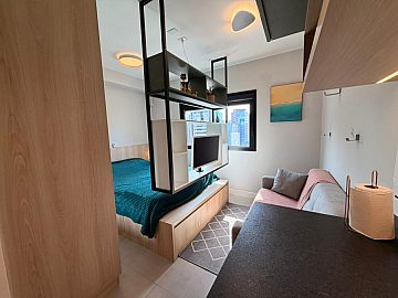 Projetado e decorado por arquitetos, o studio possui: Marcenaria diferenciada em cores sóbrias e elegantes em todos os ambientes. O foi espaço pensado para facilitar o dia a dia de seu morador. O studio nunca foi alugado, era para uso do proprietário que o utilizou por pouco tempo. Ele conta com cama queen size, geladeira Samsung inverter super silenciosa, cooktop Eletrolux, microondas Panasonic, ar-condicionado. Todos os itens e eletrodomésticos são novos com pouquíssimo uso