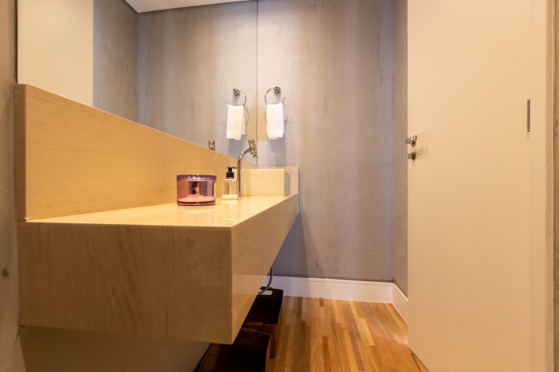 Excelente planta com living ampliado, ideal para três ambientes, com lavabo e vista para área externa. Piso em madeira tauari; ar-condicionado em todos os ambientes e persianas elétricas; A cozinha está equipada com cooktop, bancada em Limestone e armários planejados. A área de serviço é completa com banheiro e dormitório.