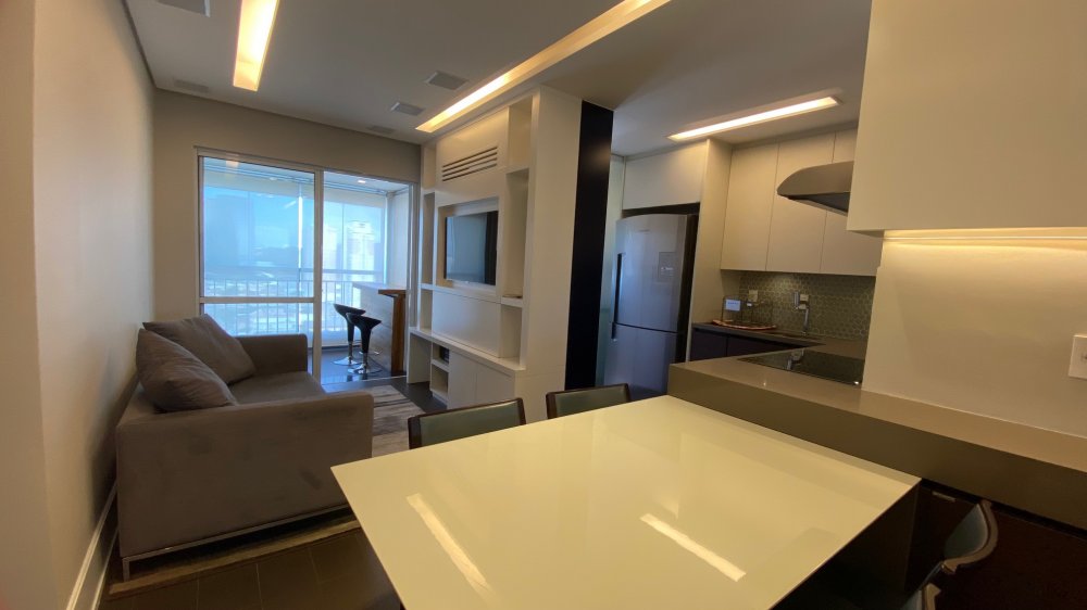 Apartamento completamente reformado, mobiliado e decorado. Armários Kitchen, piso Portobello, todos os armários feitos por marcenaria de renome; ar condicionado em todos os ambientes, pia da cozinha em Limestone e dos banheiros em mármore, churrasqueira em aço inox. Andar alto e vista livre. 2 dormitórios sendo um suíte com som ambiente, TV e cama recém adquirida. O segundo quarto pode ser usado com escritório ou dormitório. 2 vagas de garagem.